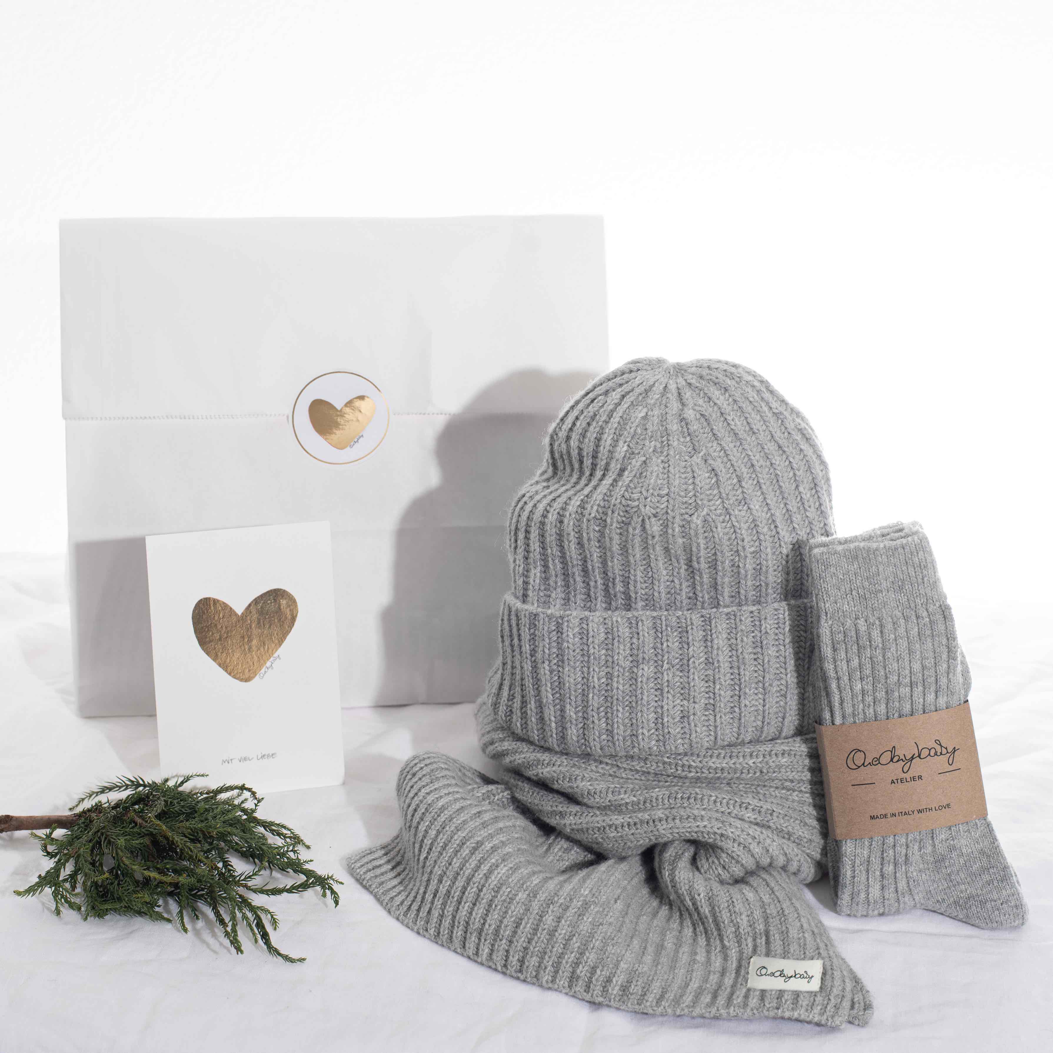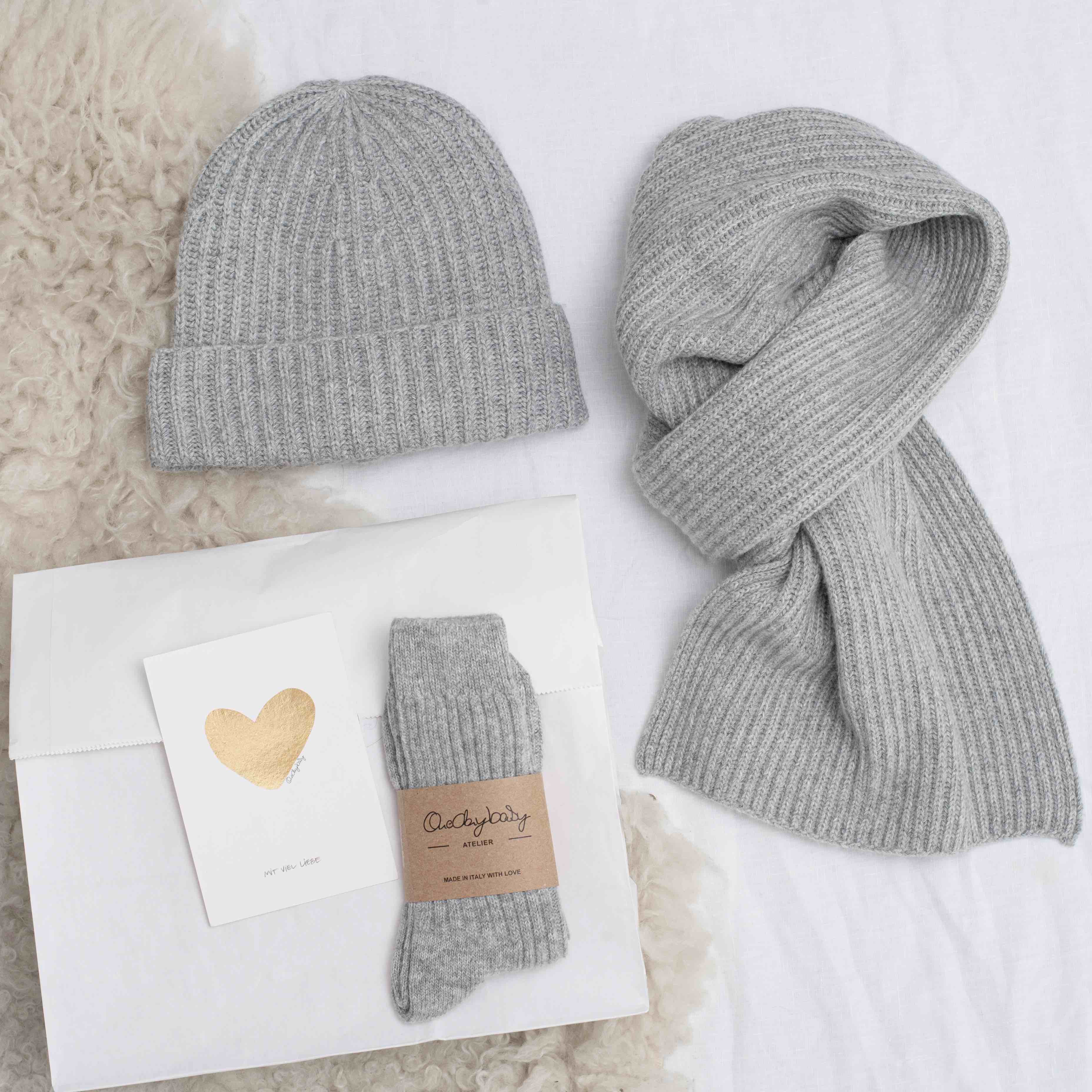 Unser perfektes Geschenk für Dich - Mütze, Schal und Socken, farblich passend und aus unserem wunderbaren italienischen Cashmix-Garn gestrickt. Die Mischung ist nicht nur superweich und kuschelig, sondern auch zu 100% recycelt.