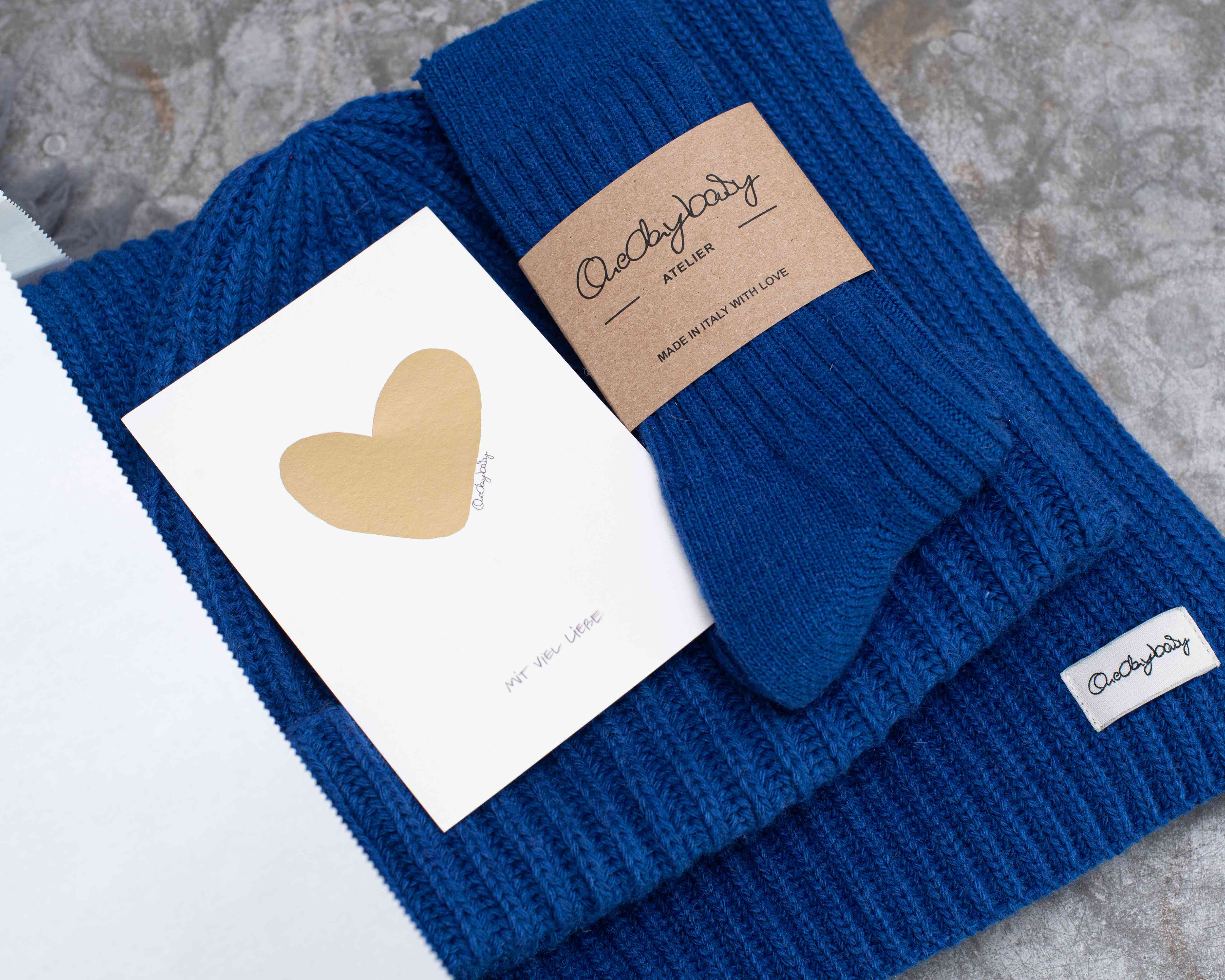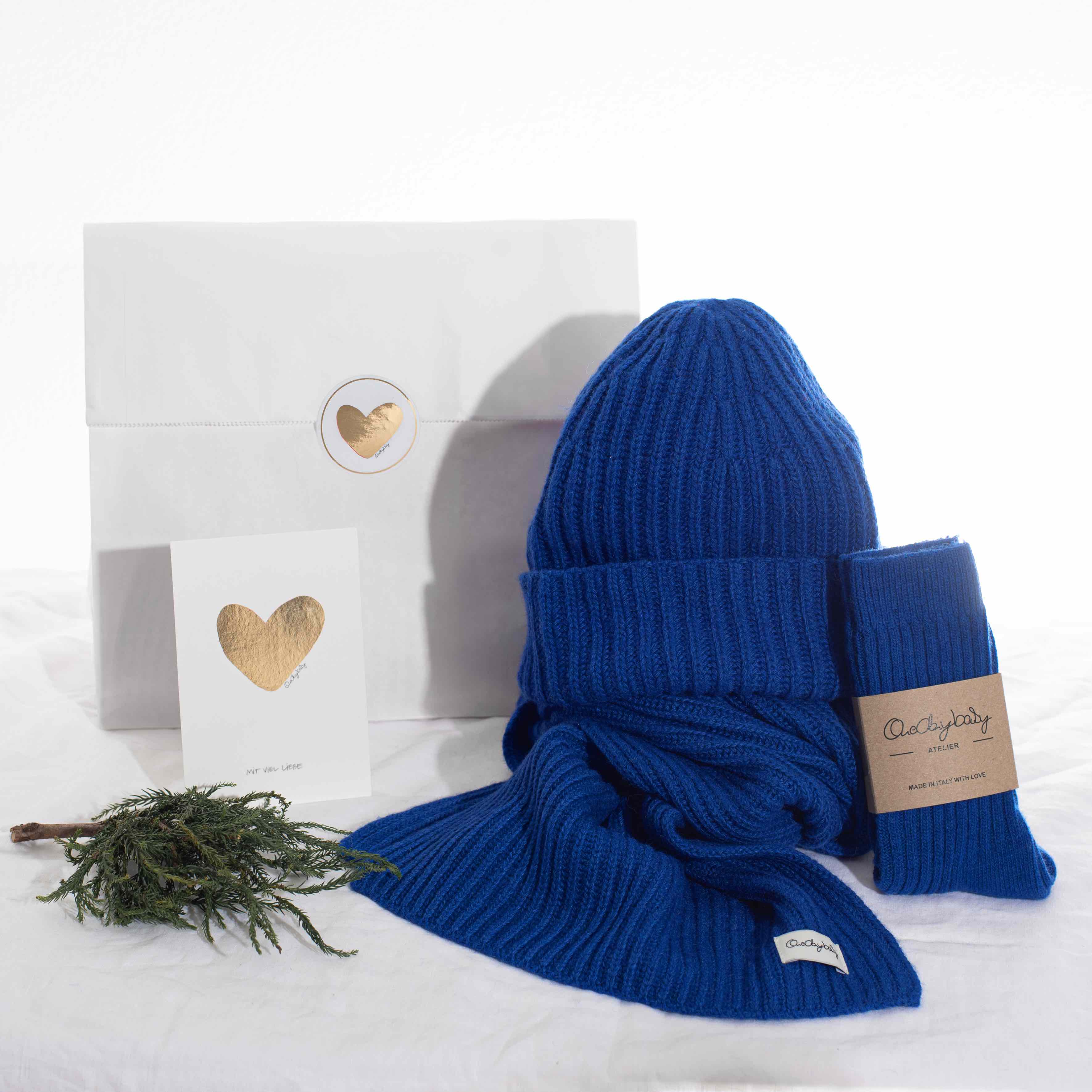 Unser perfektes Geschenk für Dich - Mütze, Schal und Socken, farblich passend und aus unserem wunderbaren italienischen Cashmix-Garn gestrickt. Die Mischung ist nicht nur superweich und kuschelig, sondern auch zu 100% recycelt.